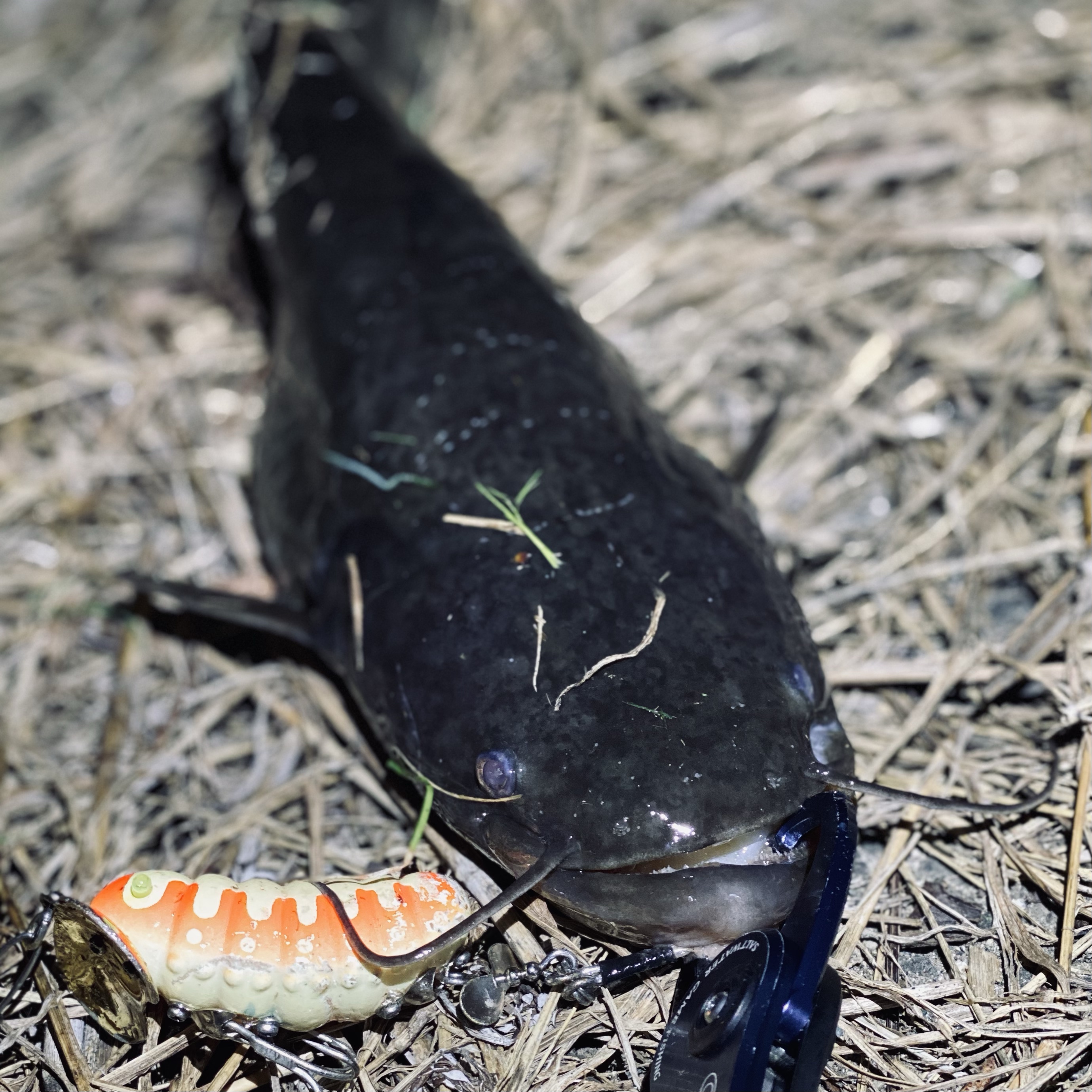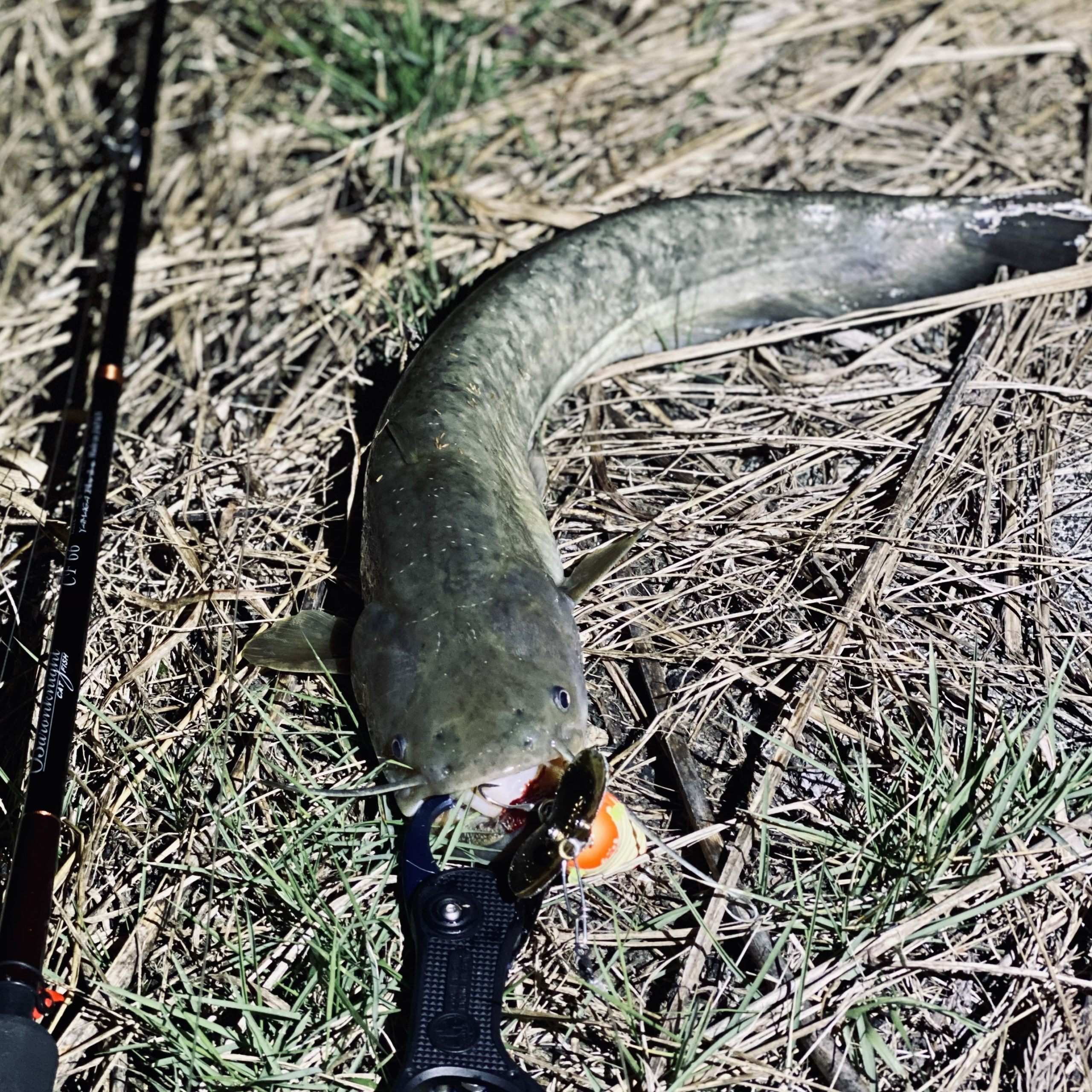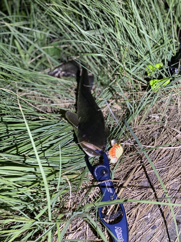 フックセットが良かったのか、引き抵抗のある羽根ものを激しく流れ込み渦巻く河川から引き出すやりとりをしても、バレる事なく2ナマズを釣り上げることができました。