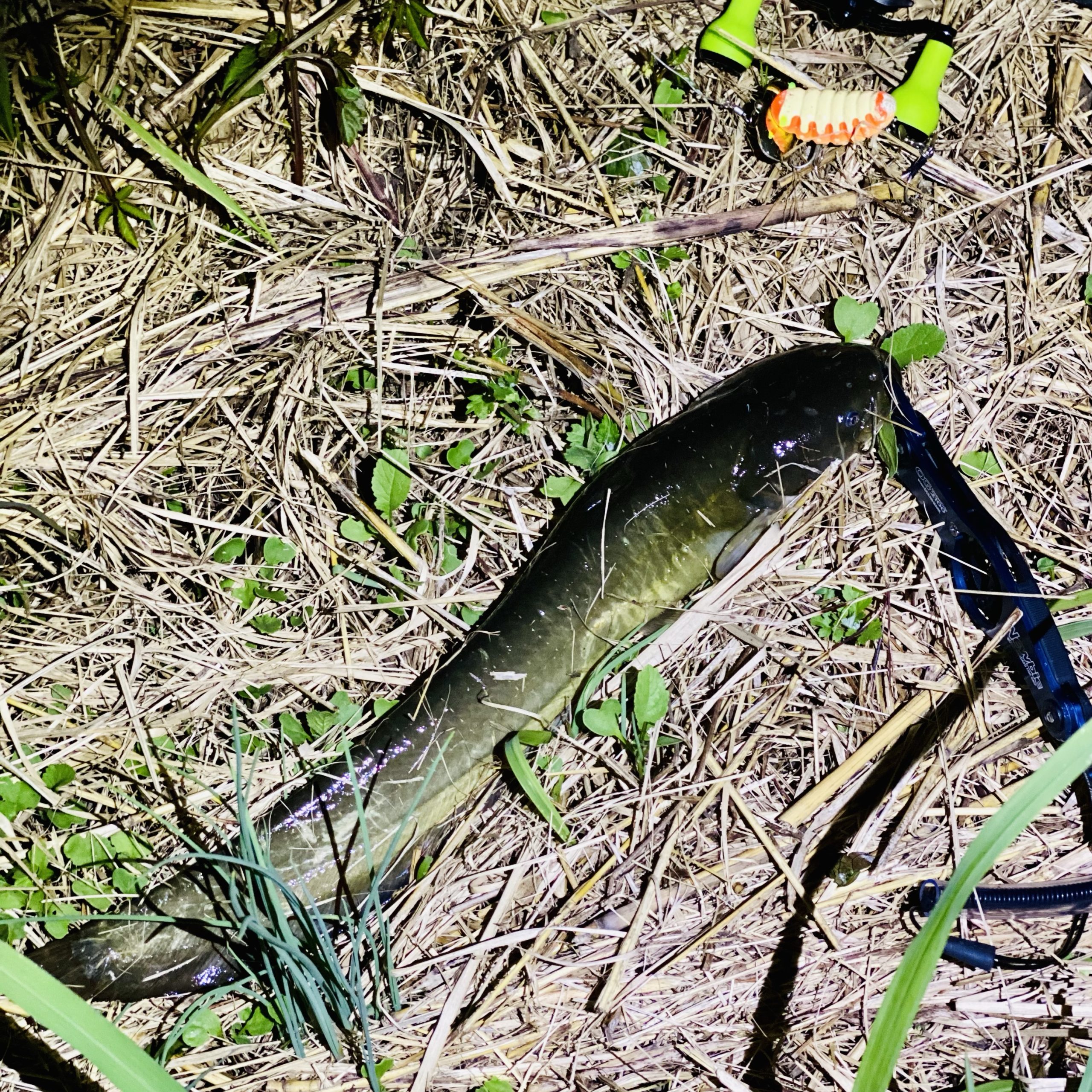 夜活ナマズゲーム。いつもの小河川。右岸攻めを左岸攻めに変えたらバイト!ほかに新場所の小水路。ルアーをピックアップしようとしたらバイト!なんとラッキーでした。#熊本 #ナマズ釣り #ナイトゲーム #夜活 #スミス #キャタピークリッカー #エクステプロペラ
