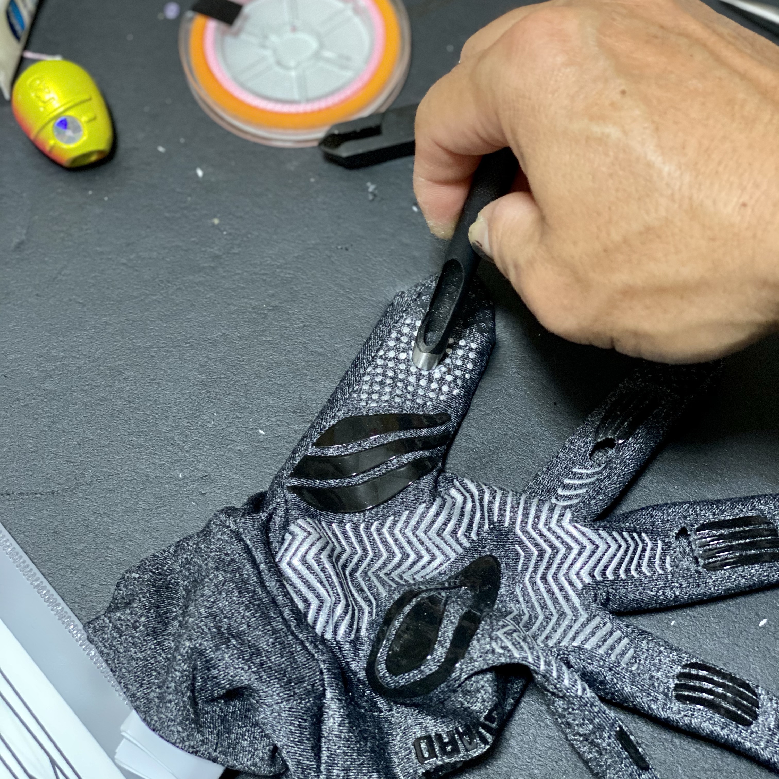 指先をバッツリ切ると、縫い目からほつれて破れるので、穴あけポンチで関節部に穴開けて、指が出し入れできるように工夫しました。
