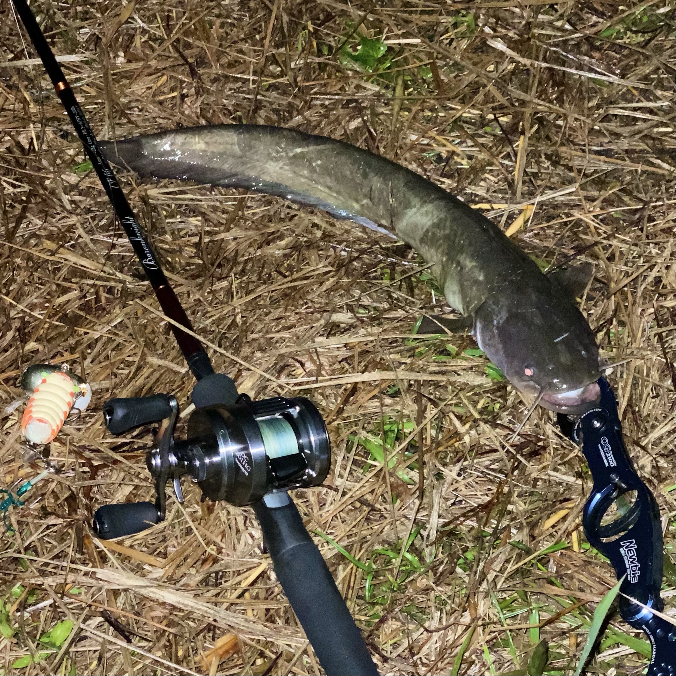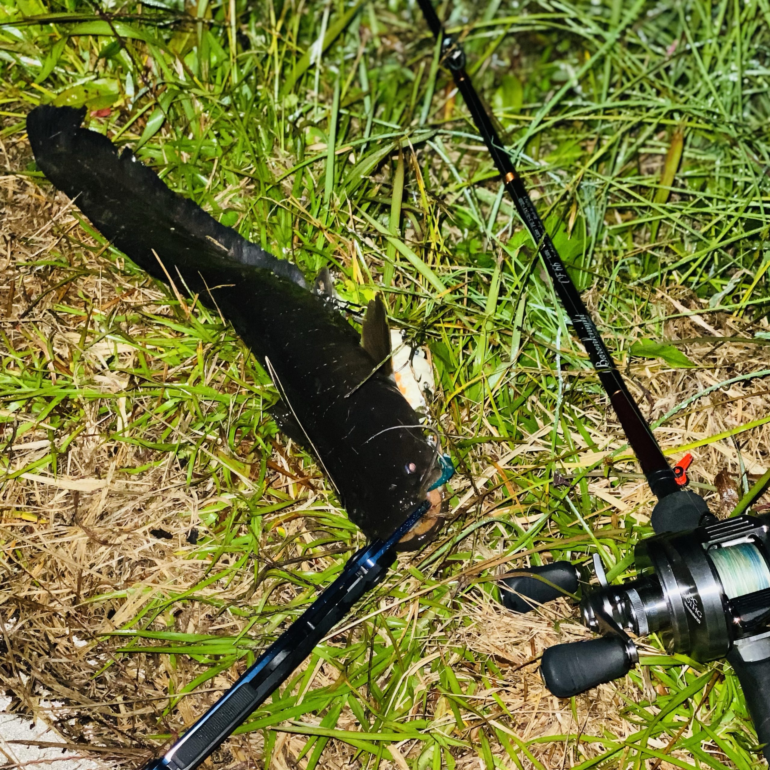 ヤマガブランクスのバロンナイトcf66はナマズ専用のカーボンチューブラーロッドで、張りが強めの作りになっているので、安心して抜き上げます。