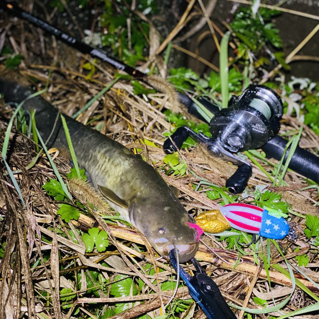 今日は小河川で大きなバイトを3回逃した後、一級河川の流れ込みでステイからの自動ケツフリで2ナマズゲット。