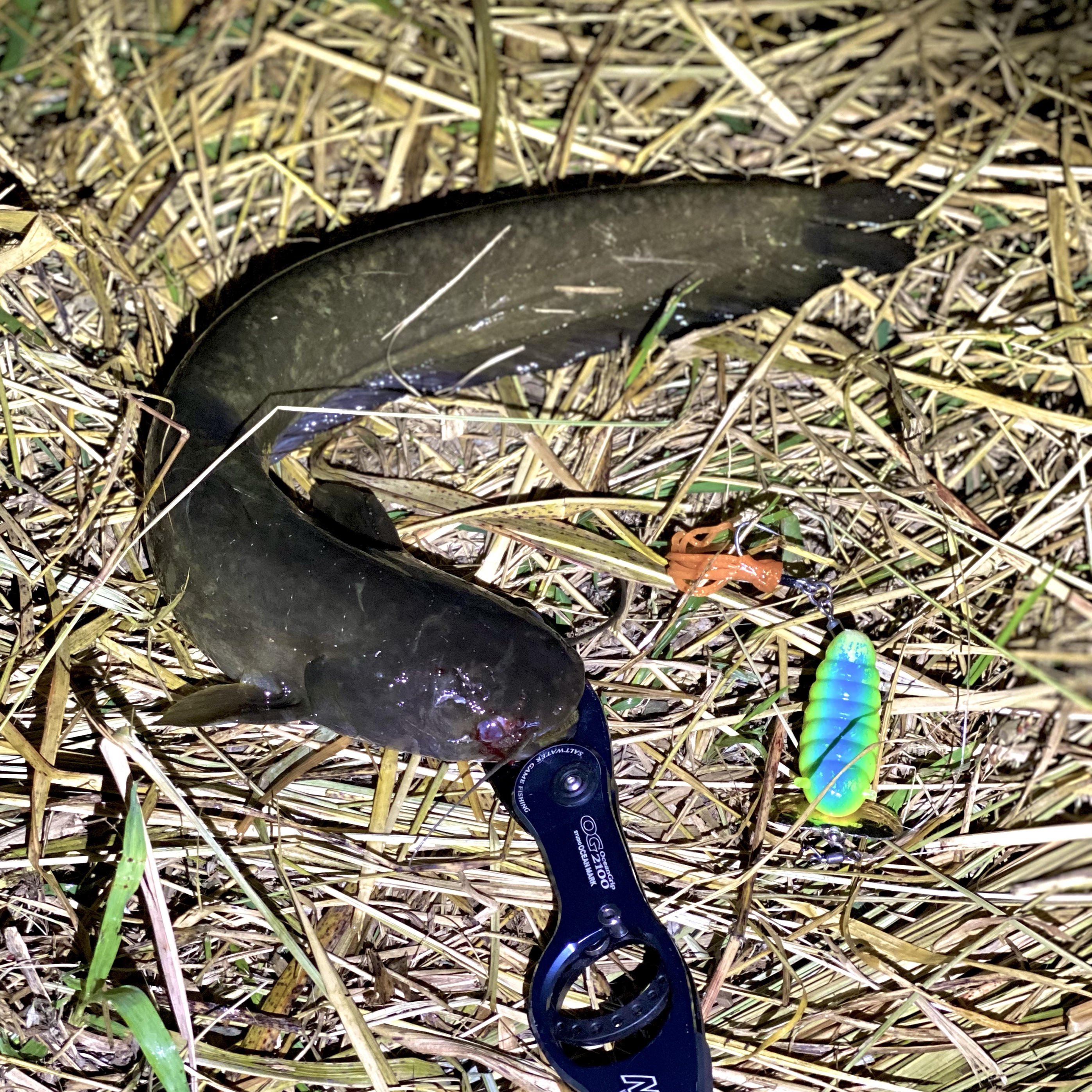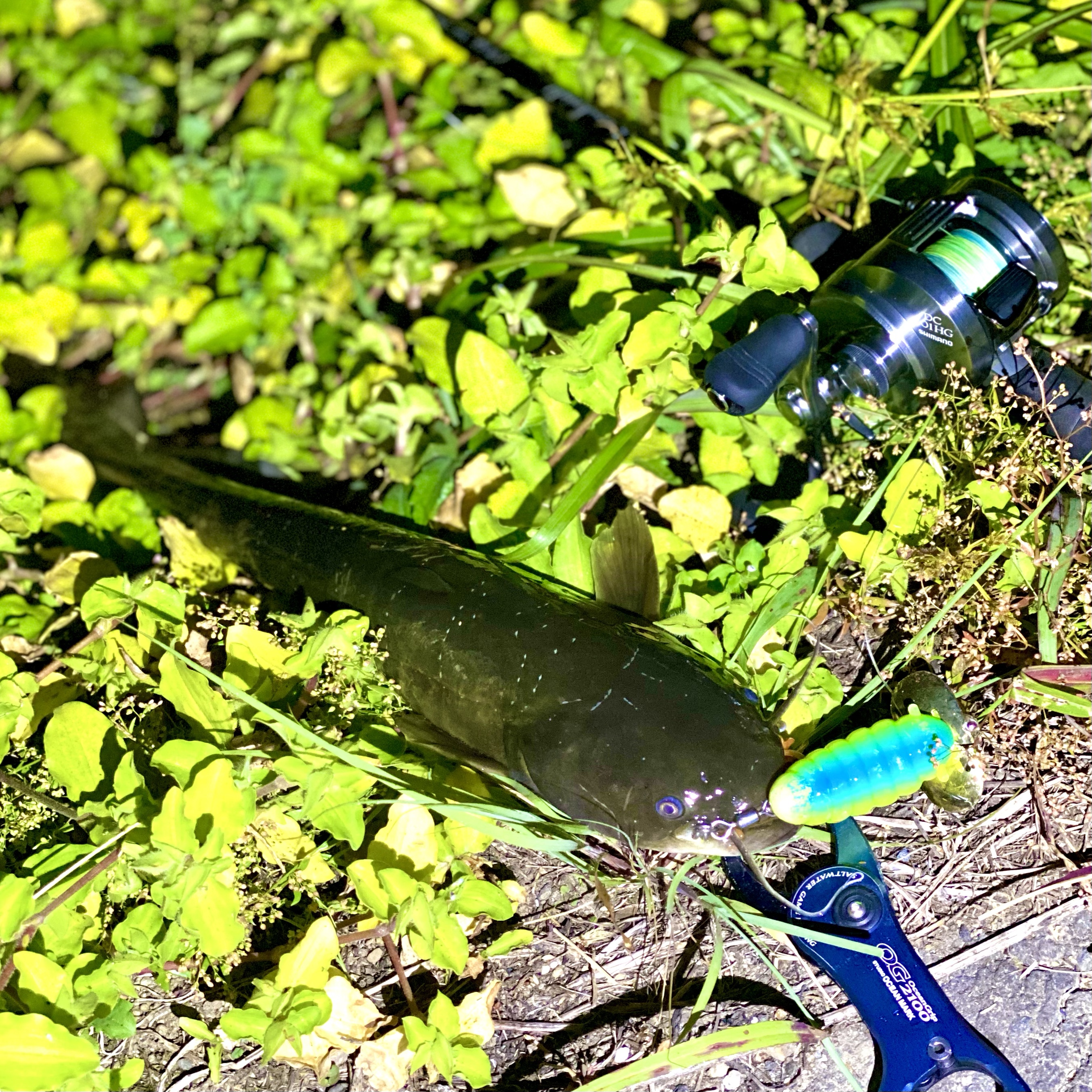 上がってきたのは、1級河川菊池川のナマズと呼ぶにふさわしい、60cmオーバーのでっぷりナマズ。